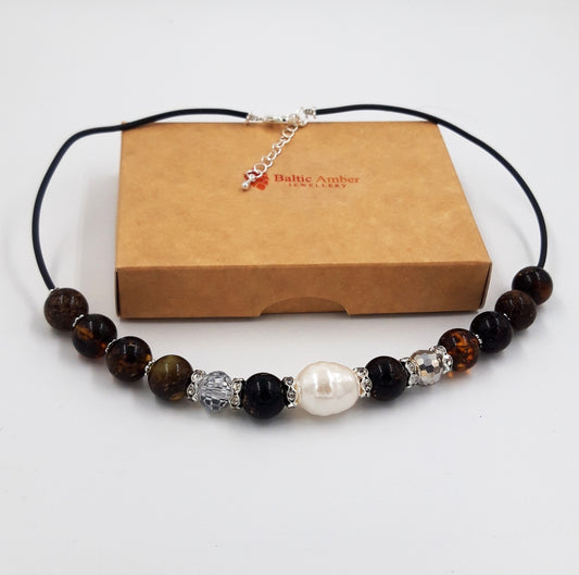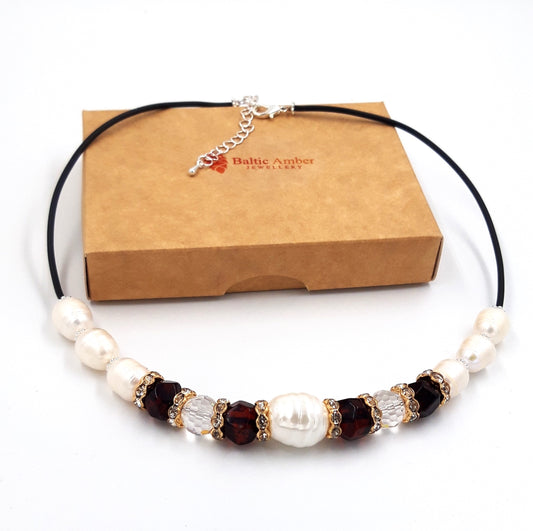 Baltic amber necklace for adults with freshwater pearls and Swarovski crystal