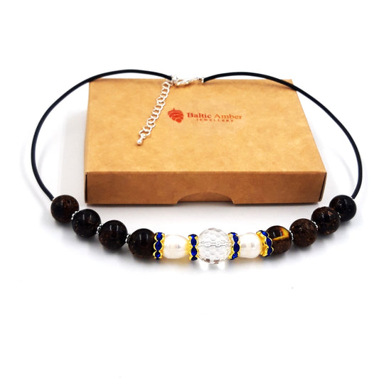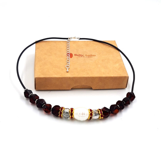 Baltic amber necklace for adults with freshwater pearls and Swarovski crystal